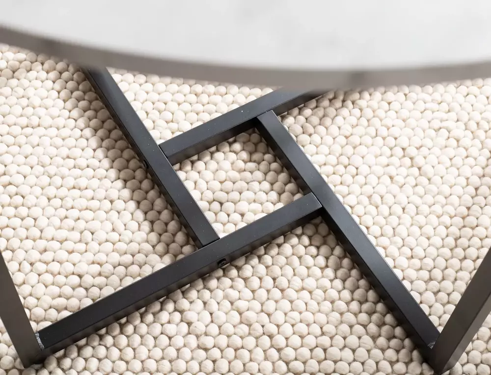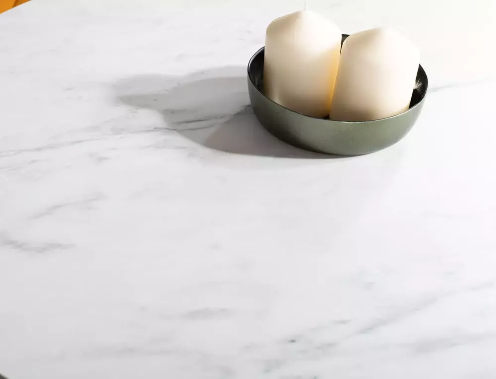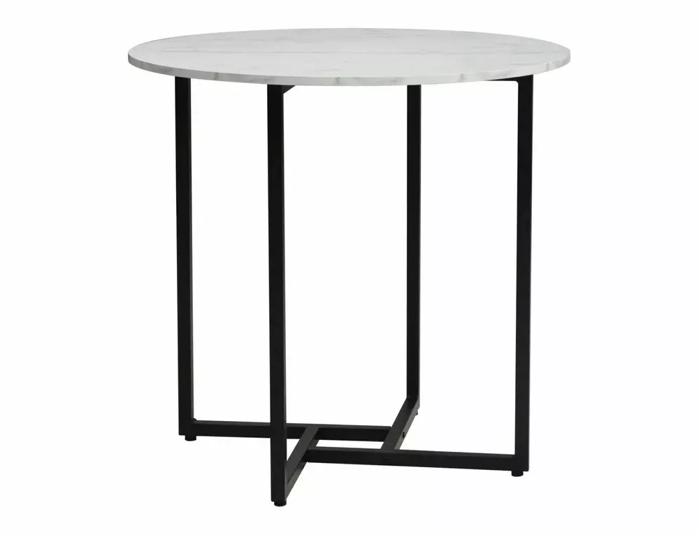 • White marble effect laminated top paired with black metal legs — elegant and contemporary. -