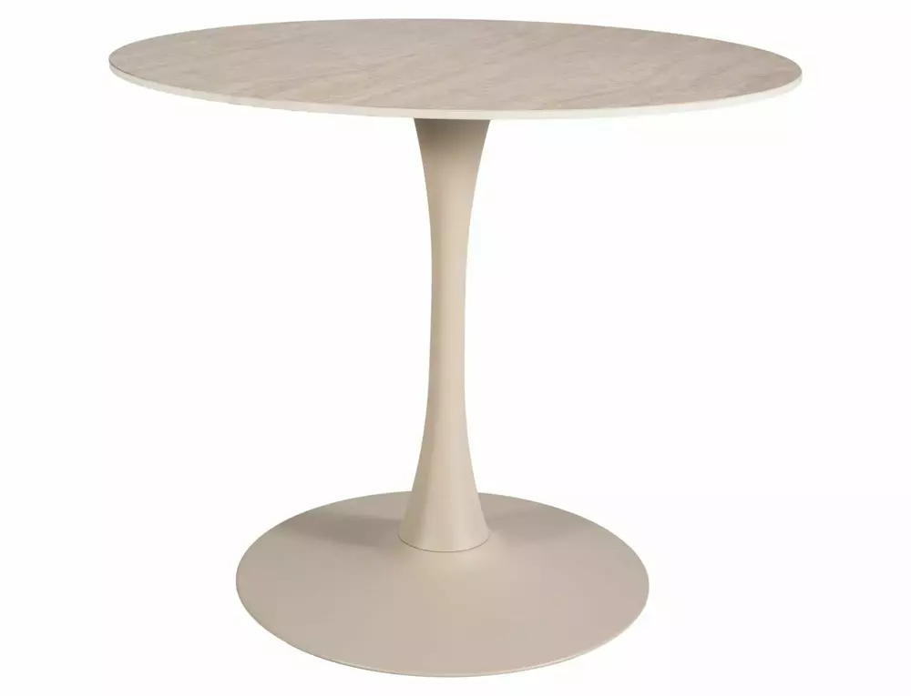 The sturdy metal base provides stability and long-lasting strength, finished in a soft matte beige / cashmere tone that complements the elegant ceramic surface. The harmonious color palette creates a warm, inviting atmosphere perfect for stylish dining spaces.