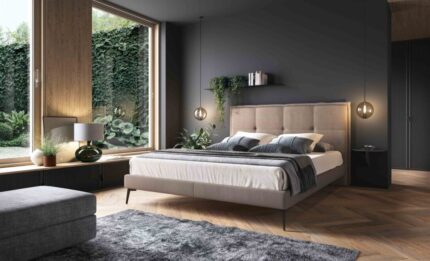 The Ariana upholstered bed features a slim and graceful silhouette, highlighted by exceptionally high legs measuring 17 cm, which give the design a light and elegant appearance while allowing for easy cleaning underneath the bed.