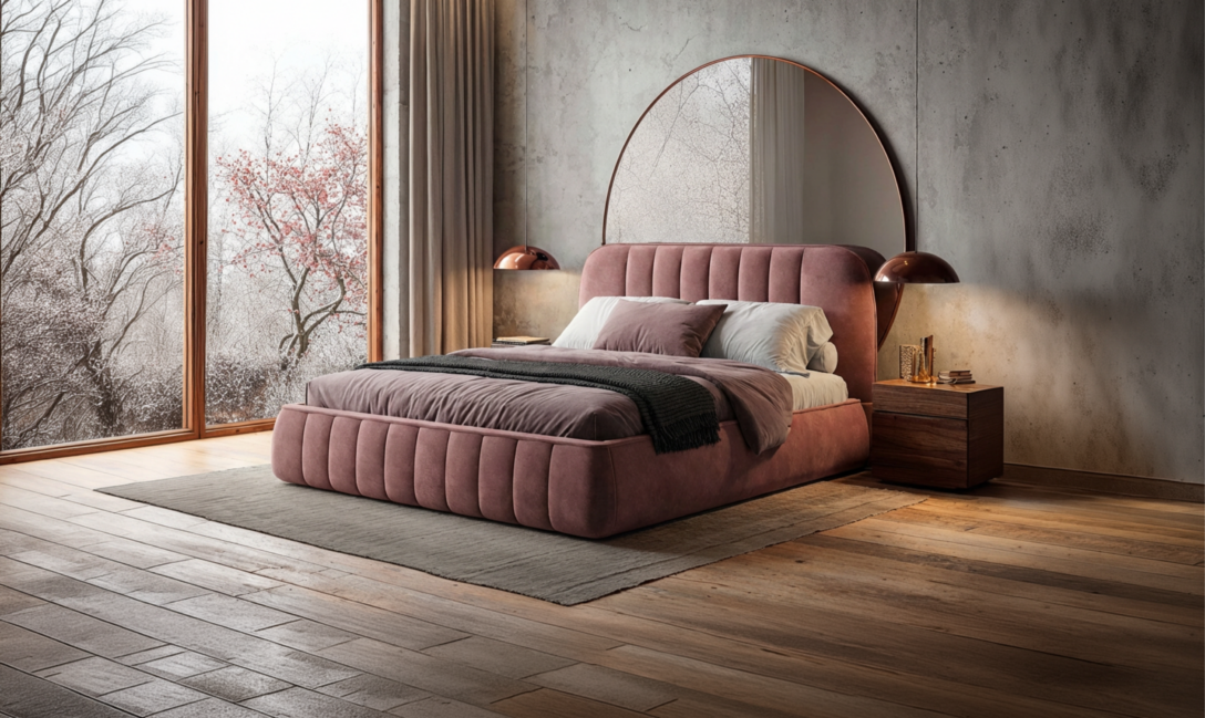 The Calira bed is a unique model that impresses with its harmonious, rounded shapes and subtle elegance. Its low, floor-level construction reflects contemporary interior design trends, enhancing the cozy and comfortable character of any bedroom. Vertical stitching on the front frame perfectly complements the rhythmic sections of the headboard, creating a cohesive and refined composition. These delicate details add depth and visual structure, giving the bed a timeless appeal.
