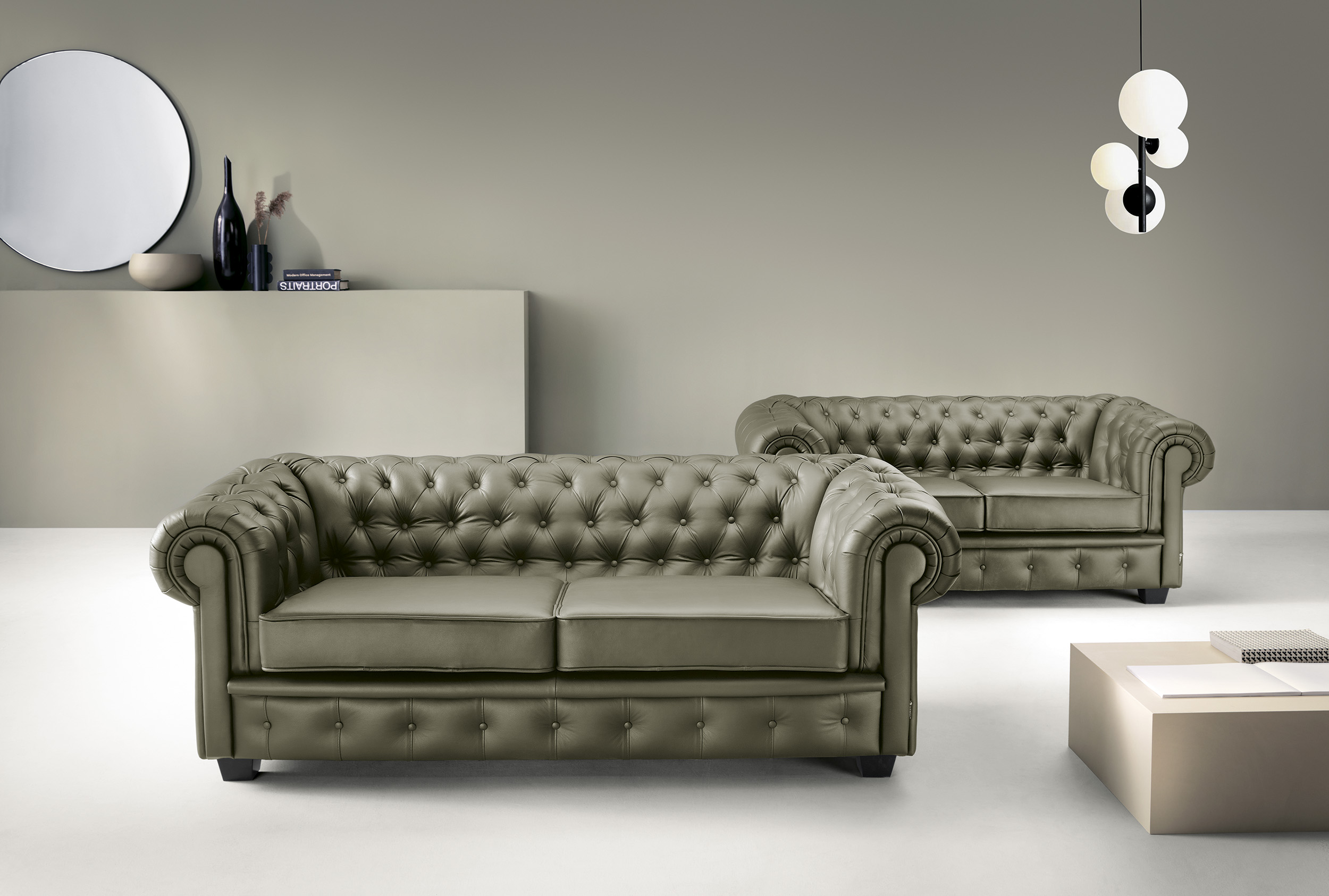 The Chesterfield Collection in genuine natural leather embodies timeless British elegance and exceptional craftsmanship. Featuring the iconic deep button tufting, rolled arms, and classic low back silhouette, this collection adds prestige and refined character to any interior.