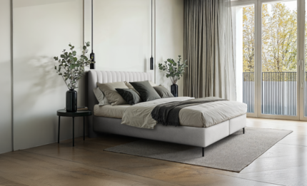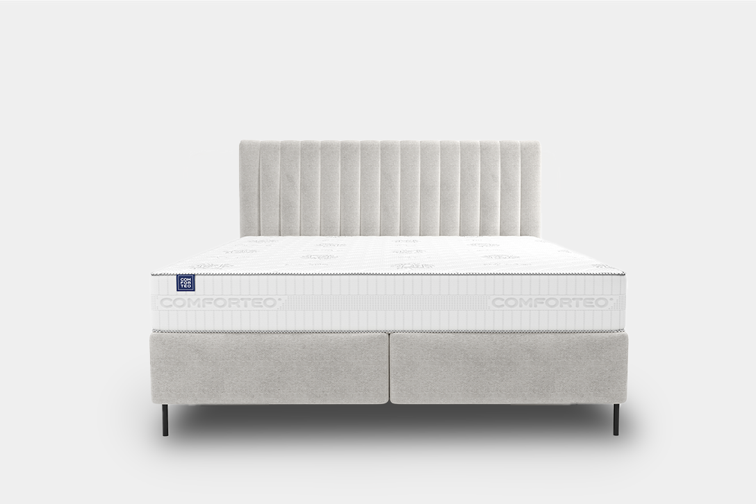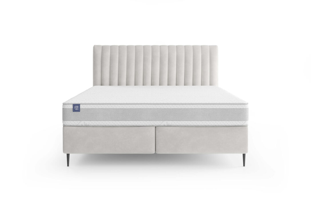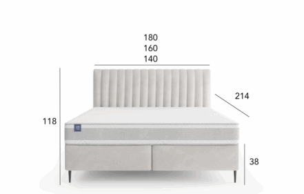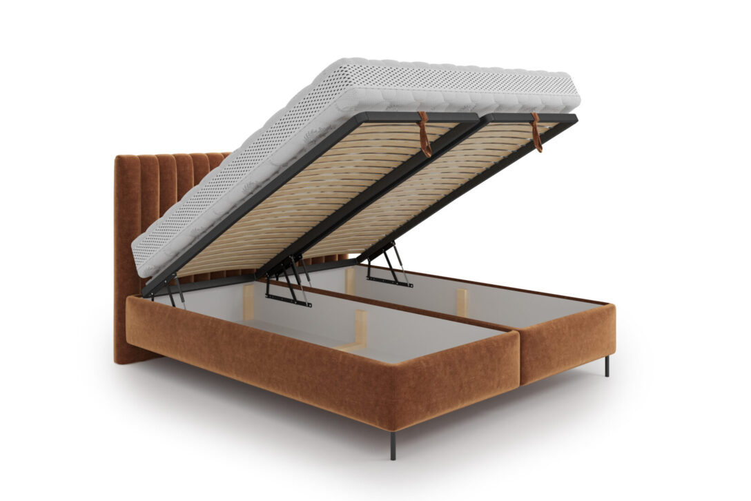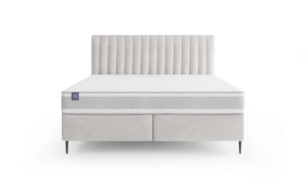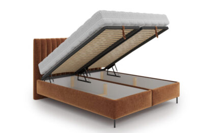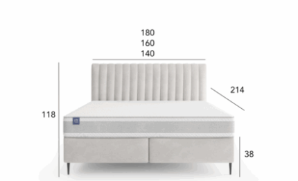 The bed consists of two practical storage boxes, providing ample space for bedding and helping keep the bedroom organized. The tall headboard features dense vertical stitching, adding elegance and emphasizing the bed’s distinctive look.