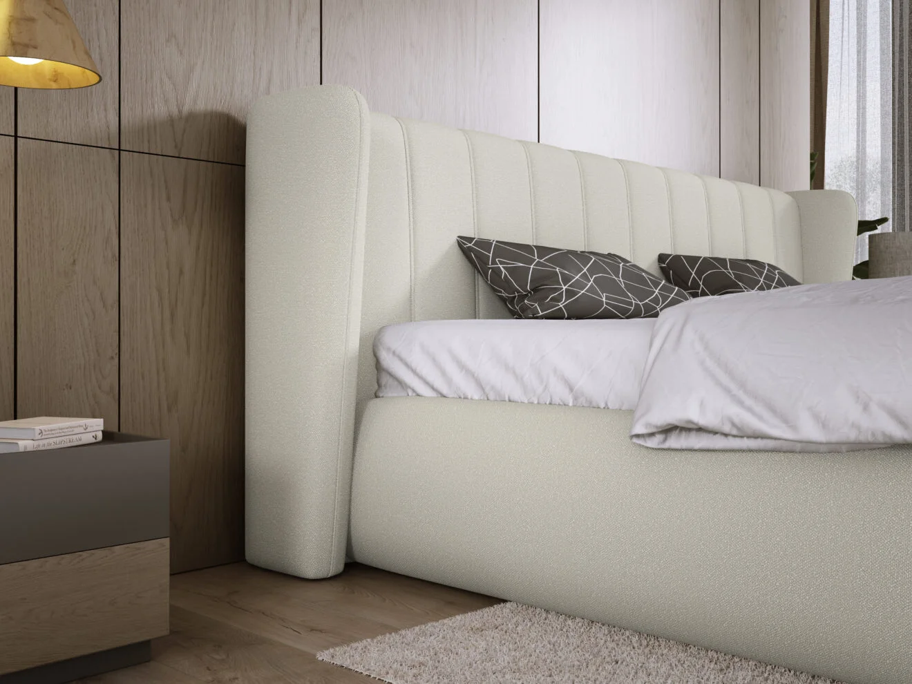 One of the key features of the FLORENCE bed is its beautifully shaped headboard. The rounded form combined with vertical stitching creates a harmonious and elegant design. Moreover, these subtle details enhance the modern character of the bed.