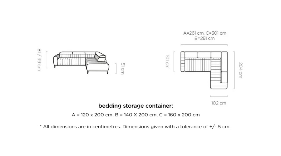 | Gandi L Corner Sofa Bed C 160 | H81 (99) / W204 / L301 CM | €2799 |