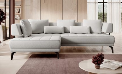 A modern corner sofa placed on high, elegant legs. Electric adjustment of the seat depth allows you to adjust the type of rest to the individual needs of users, guaranteeing the highest level of rest. The model will fit perfectly into modernist interiors. Characteristic backrests and a set of pillows make Giotto the dominant element of any living room and will look great in its central part, because it is a free-standing corner sofa.
