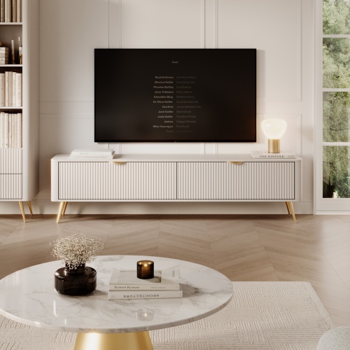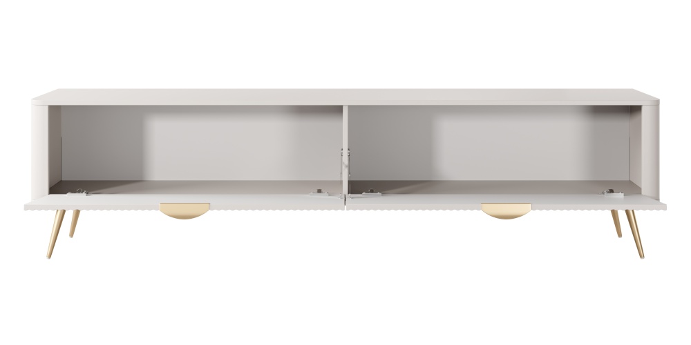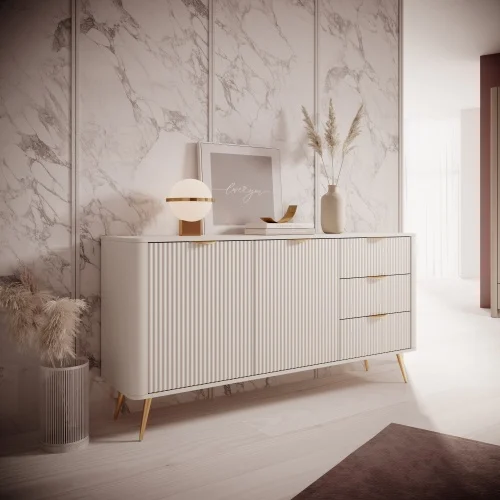 The Lante set will allow you to create an arrangement full of harmony and subtlety, and at the same time fashionable and chic. Warm beige brings peace and balance to the interior, matching perfectly with golden accents, which makes the room cozy and elegant at the same time. Rounded edges and grooved fronts add modernity and originality to the furniture. Lante is a set created for those who love modern forms and subtle, glamorous colors.