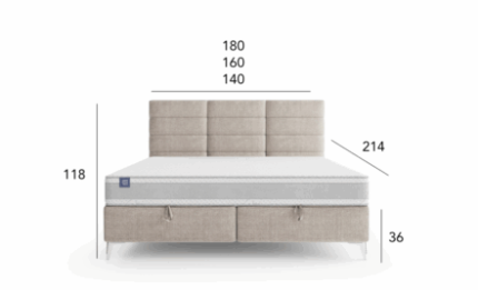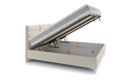 The base consists of two storage boxes with integrated bedding compartments, with a convenient front-opening mechanism from the foot of the bed, providing practical storage without compromising style. Its tall headboard with geometric stitching adds a modern touch and emphasizes the bed’s distinctive design.
