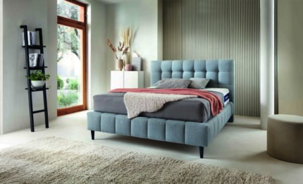 The Magic upholstered bed, featuring a tall 122 cm headboard, exudes elegance and coziness. Its distinctive design includes a soft mosaic of stitching and quilting on the headboard, complemented by vertical seams along the frame that give the bed plush, pillowy contours. Black legs, standing 20 cm high, add a sense of lightness to the overall structure. This design is not only aesthetic but also practical—ideal for bedrooms with underfloor heating, as it maintains cleanliness beneath the bed and allows easy access for robotic cleaners.