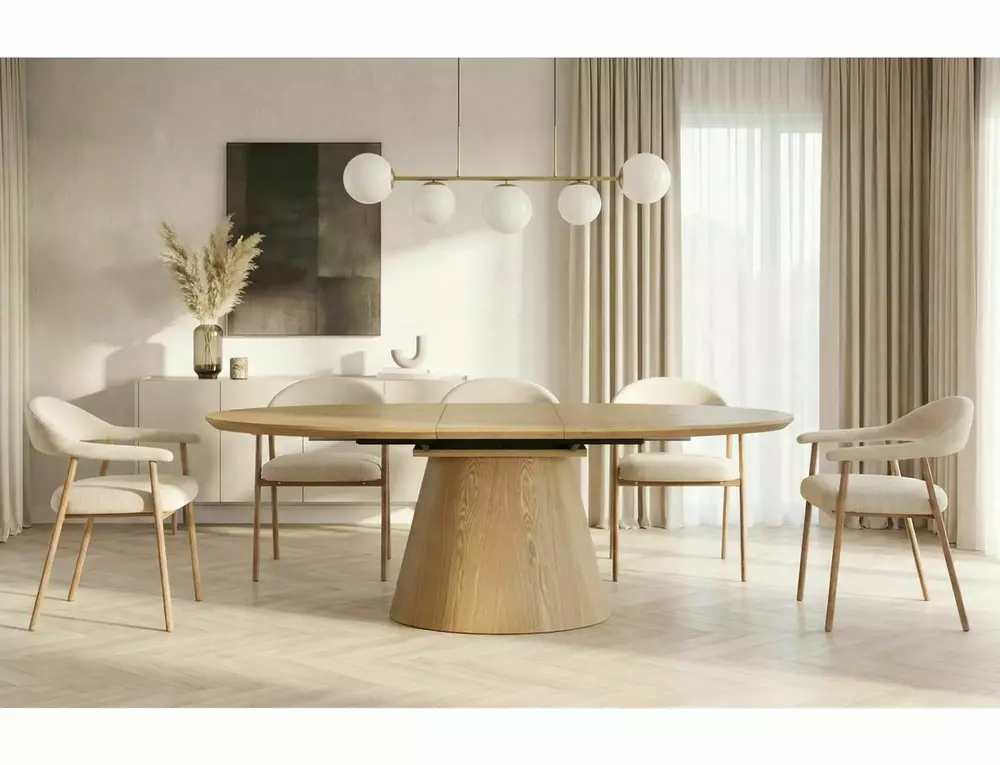 The MAROCCO table combines natural beauty, functionality, and timeless style. Its extendable feature provides flexibility for any occasion, while the oak veneer ensures a warm and sophisticated look. Ideal for homes seeking a practical yet elegant dining solution.