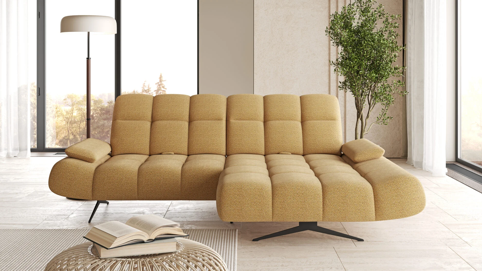 The Moreno Corner Sofa is a designer piece created for modern interiors where style, comfort, and functionality matter. Its light, elegant form and high legs give the sofa a sophisticated appearance while adding a sense of space and openness to the living room.