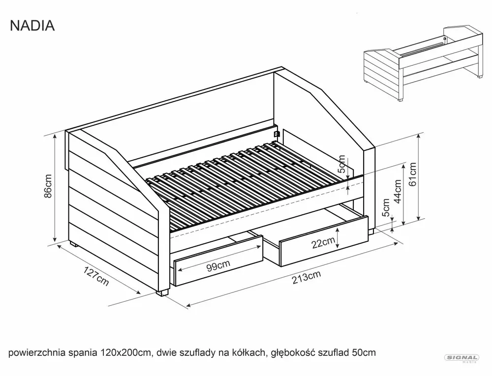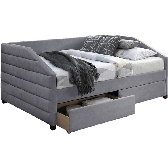 | Description: Bed with two drawers, fabric. The set includes a frame made of wooden slats. Suitable mattress size: 120 x 200cm. |