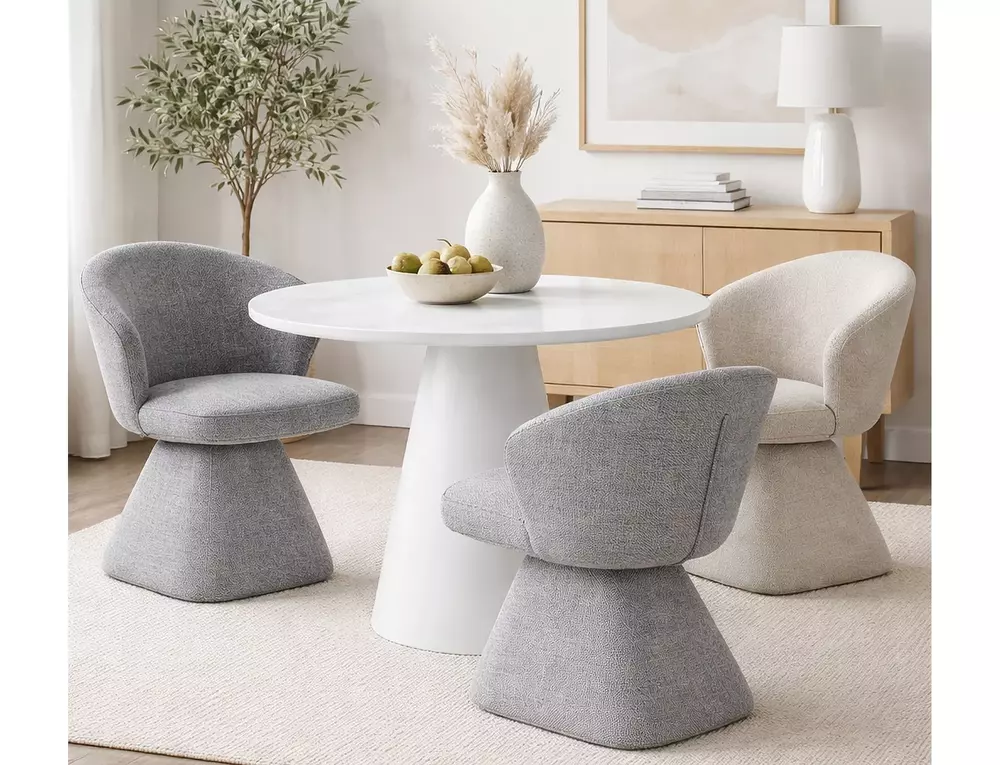 Designed with an auto-return 360° swivel seat, the NAGO Chair rotates smoothly in all directions and automatically returns to its original position, providing ergonomic comfort and functionality. Fully fabric-covered for a soft, cohesive look, this chair is ideal for dining rooms, home offices, or modern living spaces.