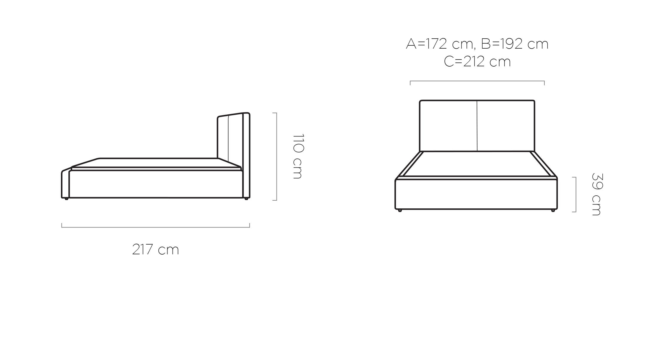 A = 140 x 200 x 24 cm B = 160 x 200 x 24 cm C = 180 x 200 x 24 cm| Bed Size | Double Bed Frame 140×200, King Bed Frame 160×200, Super King Bed Frame 180×200 |
