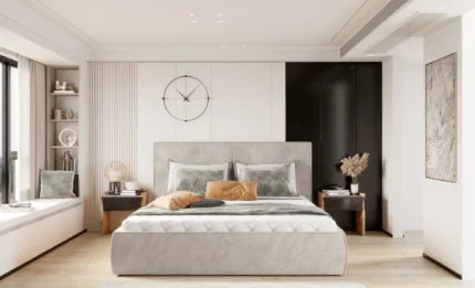 The Nicole bed brings a touch of modern sophistication to any bedroom setting. Featuring a clean, minimalist headboard and sleek lines, it blends effortlessly with a variety of interior styles, adding a sense of freshness and refined charm.