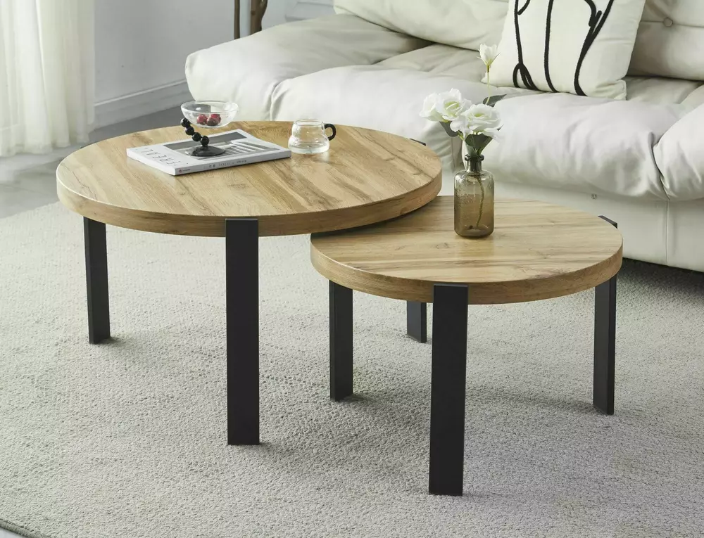 The POLO Coffee Table Set combines modern industrial style with natural warmth, making it a perfect addition to contemporary living rooms. Featuring MDF tabletops with high-quality artisan oak veneer and durable black metal frames, this set offers both stability and refined design.