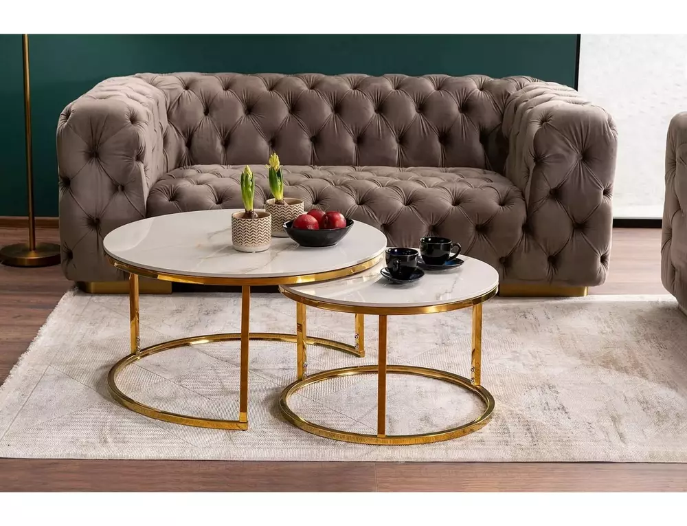 The PORTOFINO Coffee Table Set is a perfect blend of luxury and modern elegance. Featuring high-gloss ceramic tabletops in white and a sleek gold metal frame, this set brings sophistication and brightness to any contemporary living room.