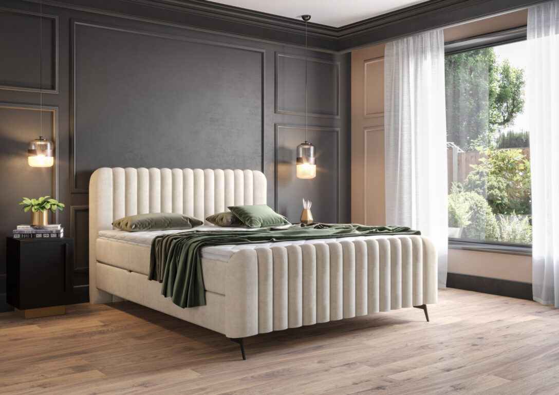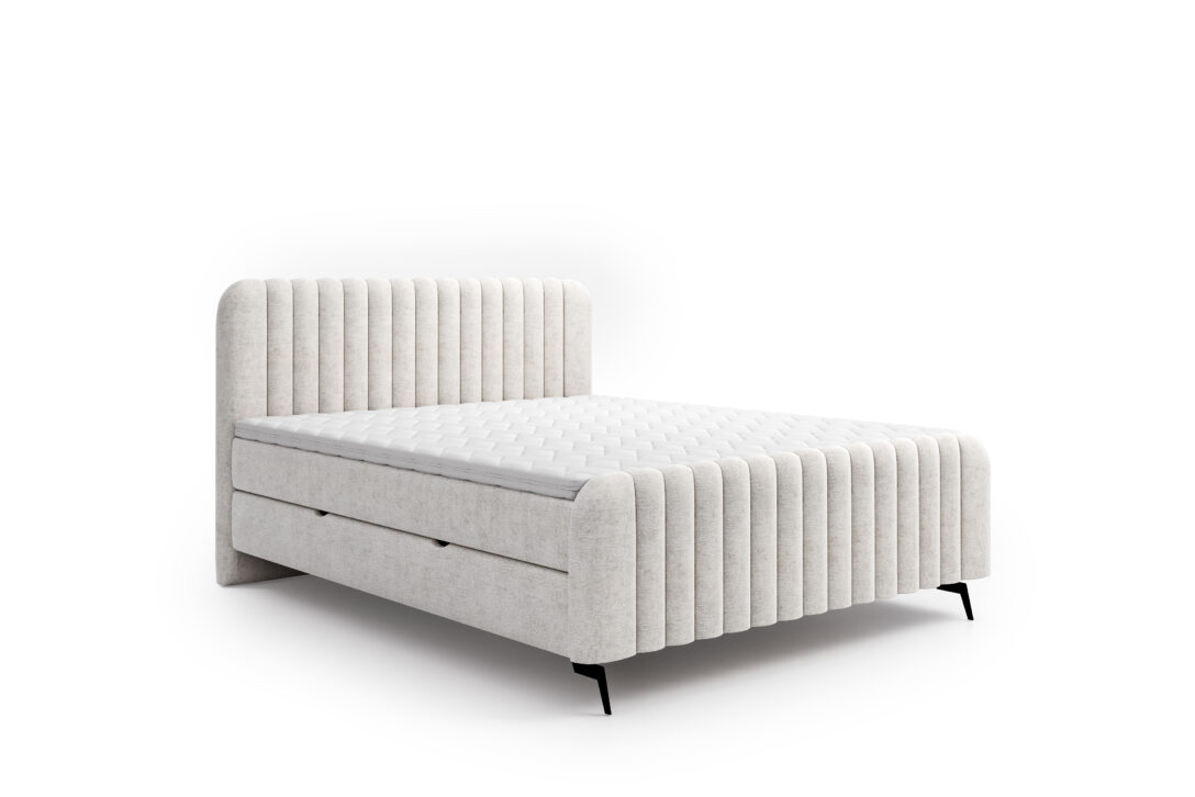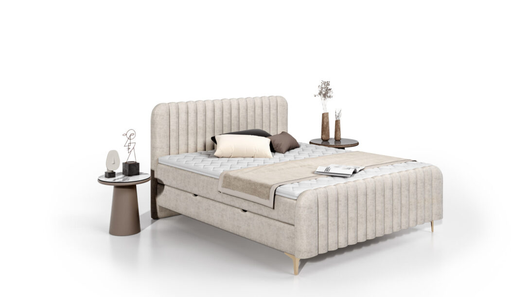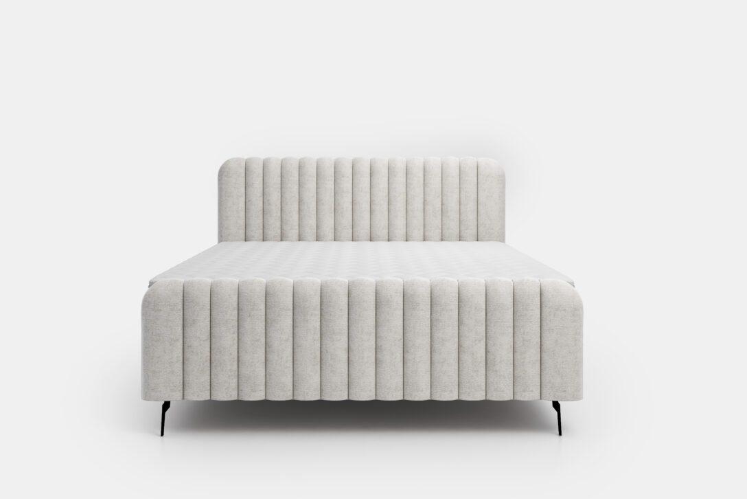 The Salva bed combines elegant design with exceptional functionality. Its subtle aesthetic is highlighted by dense vertical stitching on the headboard, perfectly harmonizing with the footboard. High 12 cm legs add a sense of lightness to the overall structure, making the bed both stylish and modern.