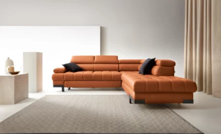 With its style, Selva will delight the most demanding fans of home relaxation. Spacious seats, modern decorative elements, properly profiled backrests and movable headrests will ensure the highest quality of relaxation. The sleeping function, thanks to a convenient “dolphin” automatic folding mechanism, allows for an efficient change into a comfortable place to sleep unexpected guests, and an additional set of bedding or a warm blanket can be stored in a container hidden in the ottoman of the furniture.