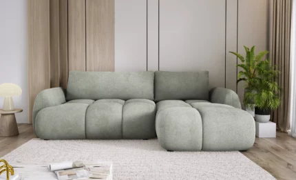 The WIND corner sofa bed is a stylish and comfortable piece of furniture designed for modern living rooms. Its distinctive character is highlighted by large, bulky tufting, which gives the sofa a bold and contemporary look while adding extra visual softness and comfort.