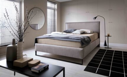 The Winter bed is the perfect choice for modern, minimalist, or loft-style interiors. Its distinctive design features a 16 cm high black metal leg that complements the black piping on the headboard, creating a bold and characteristic look. Please note that the headboard piping and metal legs are always black and are not customizable.